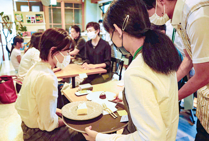 当日は生徒13人と大学生3人で運営。生徒らは来店客を席に案内したり、注文を受けたりするなど緊張しながらも機敏に動いて接客。調理室では、コーヒーやパフェなどを手際よく作り、約60人をもてなした。