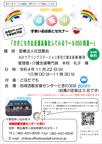 医療法人社団葵会 AOIケアリングステーション居宅介護支援事業所 木村礼子管理者を講師にお迎えし、8050問題について話していただきます。参加無料。申し込み締切11月21日(月)。