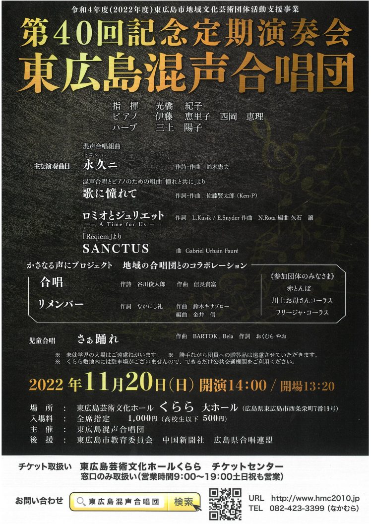東広島混声合唱団は、広島県東広島市を中心に活動する創団40有余年の市民合唱団です。