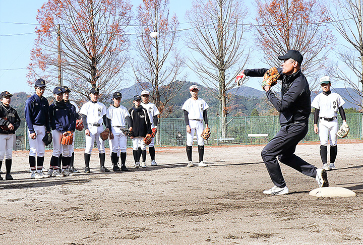 石毛さんは、予期せぬプレーから身を守り、故障をしない身のこなし方を、小林さんは、投球の基本を、それぞれ手本を示しながら指導した。