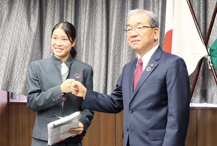 広島県内の高校から初めてとなる日本女子プロサッカーリーグの「WE(ウィー)リーグ」と契約を結び、「INAC(アイナック)神戸レオネッサ」に入団が内定した、私立AICJ高(広島市安佐南区)3年の桑原藍さんは1月13日、同高の小川潤一監督らとともに高垣広徳市長を表敬訪問した。