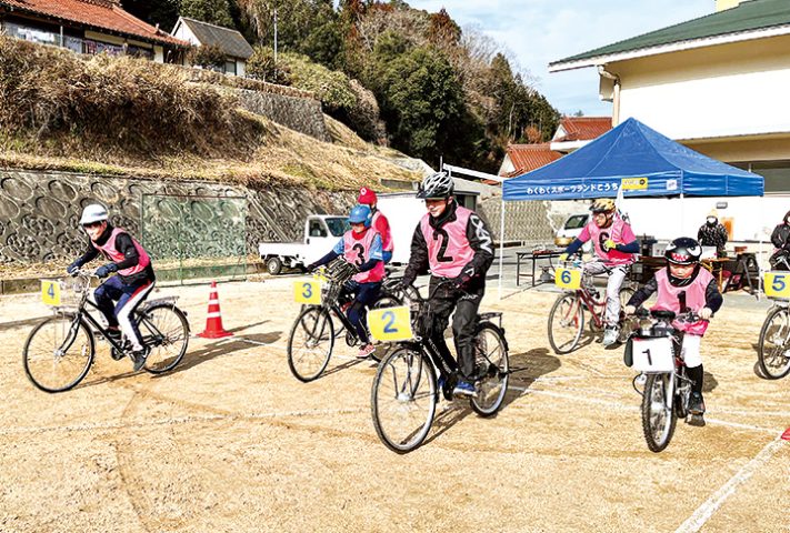 ママチャリと呼ばれる一般的な自転車をこぎながらリレーしていく、第13回わくわくママチャリ3時間耐久レースが1月22日、入野区民グラウンド(東広島市河内町入野)で行われた。7チームの45人が参加。広島大学サイクリング部の学生16人が各チームに助っ人として参戦した。1周約280㍍のコースを使い、3時間の周回回数で競った。