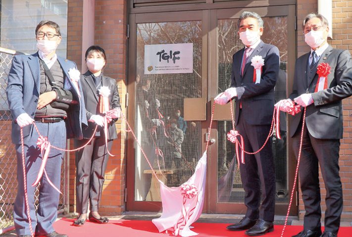 広島大(東広島市鏡山、越智光夫学長)は1月30日、学内共同教育研究施設「Town&Gown(タウン・アンド・ガウン)未来イノベーション研究所(TGIF)」の完成を記念して看板除幕式を同大東広島キャンパスで開いた。式には、越智学長や同研究所の三好千景所長ら約40人が出席。看板の文字は越智学長が揮毫(きごう)した。