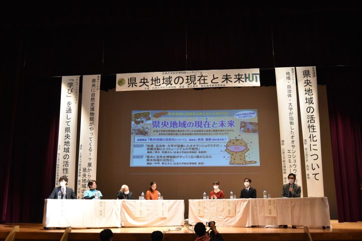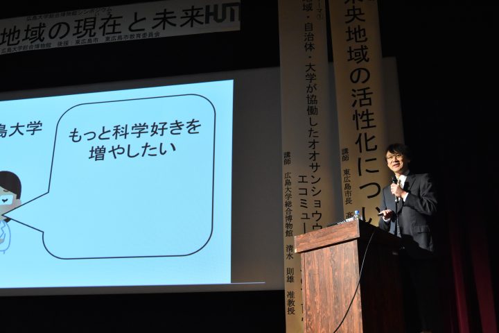 シンポジウムは、昨年の夏に広島大学総合博物館が豊栄町で行った出張展示の成果と課題を踏まえながら、自然史の教育を通じた県央地域の活性化を考えてもらうのが狙い。