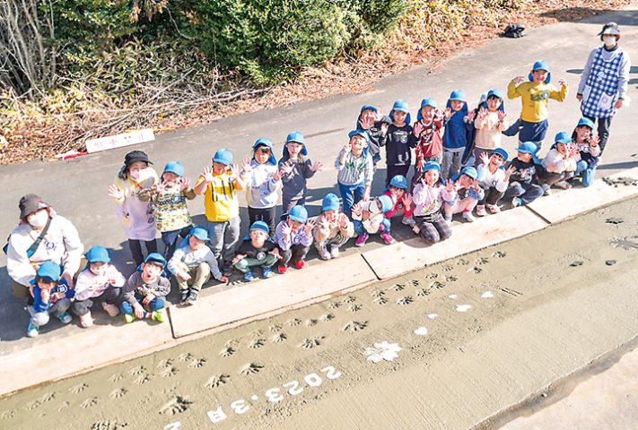 郷田地域センター駐車場のり面の工事現場で3月3日、コンクリートに手形を残すイベントがありました。工事を担当する地元の上垣組が社会貢献事業の一つとして、園児たちに思い出づくりをしてもらおうと企画。