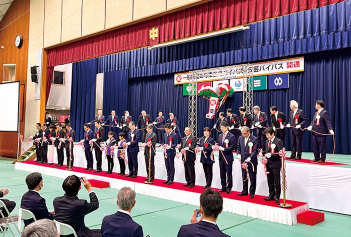 国道2号東広島・安芸バイパスが3月19日夕、全通した。開通に先立って開通式典が同日、安芸郡海田町の海田中で行われ、斉藤鉄夫国土交通大臣をはじめ湯崎英彦広島県知事など関係者約220人が出席し、開通を祝った。