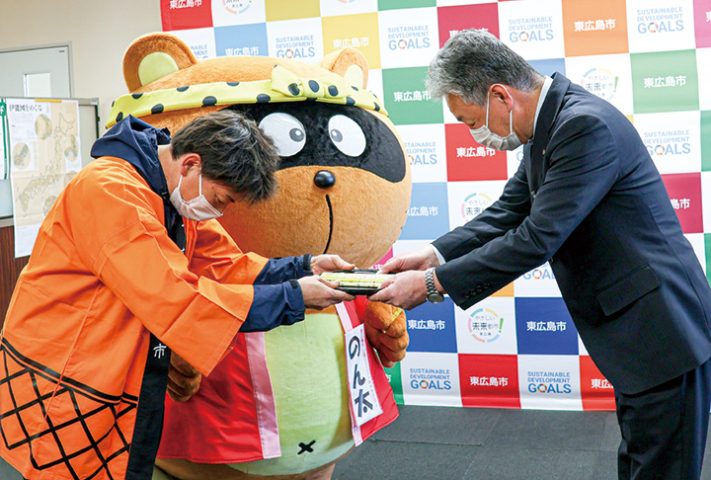 東広島市役所で3月13日、寄付受納式、感謝状贈呈式が行われ、のん太から市場一也教育長に「のん太鉛筆」が、市場教育長からはのん太に感謝状が贈られた。
