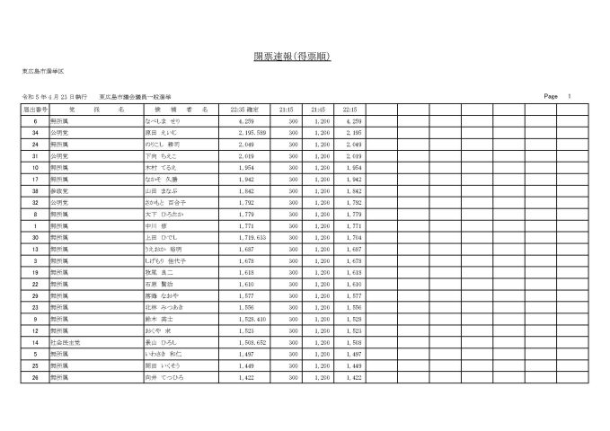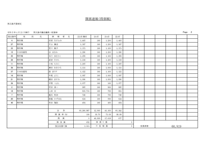 4月23日投開票の東広島市議会議員選挙の開票速報です。
