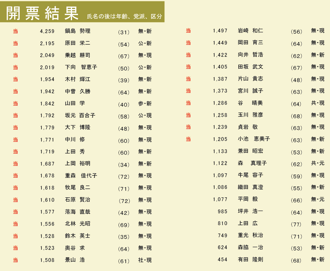 最年少は、市制施行以後の市議選では過去最多得票で当選した31歳の鍋島勢理さん。これまで一人だった30歳代の議員は4人となった。最高齢は6選を果たした現職の石原賢治さん、3選を果たした現職の重森佳代子さんの72歳だった。