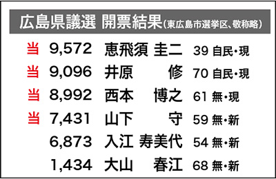 日川 鍋島さんと同様に、強い印象を持ったのが女性の木村輝江さんが5位当選を果たしたこと。「子育ての経験を生かす」をフレーズにして、確固たる地盤を持たなくても、多くの票を集めた。県議選で高屋町から出馬し、次点に終わったが多くの票を集めた入江さんの戦いの流れが続いていた印象だ。