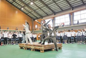 県立賀茂高校(東広島市西条西本町、冨永六郎校長)は6月14日、 同校でシアターラーニングを開き、全校生徒と保護者、職員ら約800人が参加。現役舞台俳優を講師に、自分の思いを伝える表現方法などを学んだ