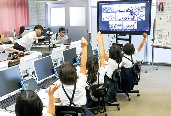 オンラインで市内の小学校がつながり、リアルタイムに情報を共有して学び合う授業は、市教委が広島大学EVRIと連携して、2021年度から社会科の授業として始めた。