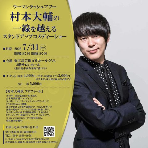 お笑い芸人ウーマンラッシュアワー村本大輔さんの単独スタンドアップコメディーショーが東広島市西条栄町の「東広島芸術文化ホールくらら」で開催されます。