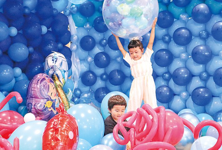 「こどもひろば」では、カラフルな風船で作ったバルーンアートで装飾し、海の中にいるような空間を演出。子どもたちは、歓声をあげながら床に敷きつめられた風船で遊んでいた。