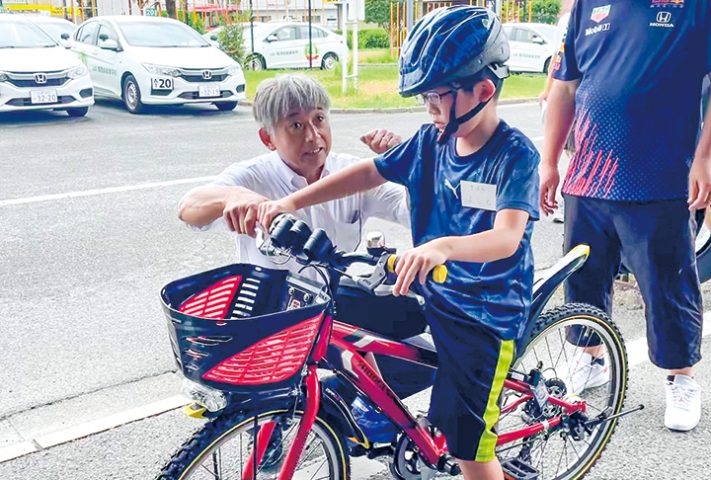 元F1レーサーの片山右京さんが8月15日、東広島市西条中央の賀茂自動車学校で、「東広島チャレンジスクール」と銘打って小学生8人に自転車の乗り方を指導した。片山さんの自転車チームの下部組織「Team UKYO Reve」が主催。今年が12回目。