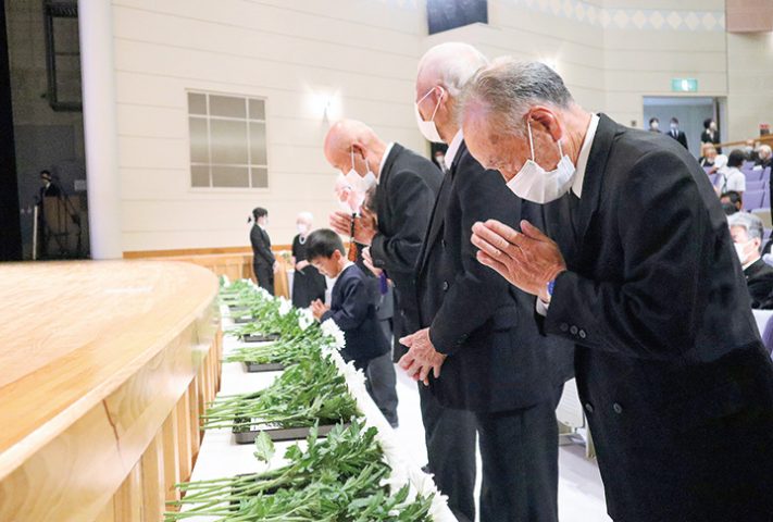 参列者全員で黙とうをした後、高垣市長が「戦争から学んだ多くの教訓を心に刻み、戦争体験の記憶を後世に継承していく」と式辞。参列者は祭壇前に設けられた献花台に白菊を手向け、戦没者をしのび、手を合わせていた。