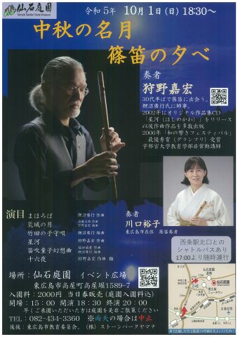篠笛奏者 狩野嘉宏氏と、東広島市在住の篠笛奏者 川口裕子氏を招いて演奏会を行います。