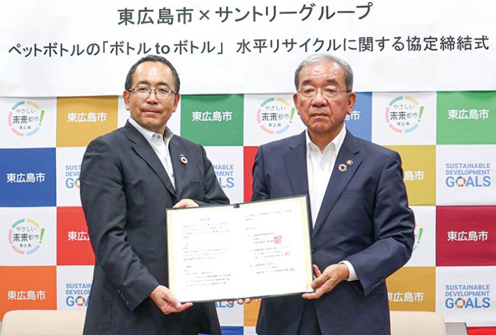 東広島市とサントリーホールディングス(新浪剛史社長)は8月21日、「『ボトル to ボトル』水平リサイクルに関する協定」を締結した。同市役所で行われた締結式には、同社サステナビリティ推進部の北村暢康部長が出席し、高垣広徳市長と協定書にそれぞれ署名した。