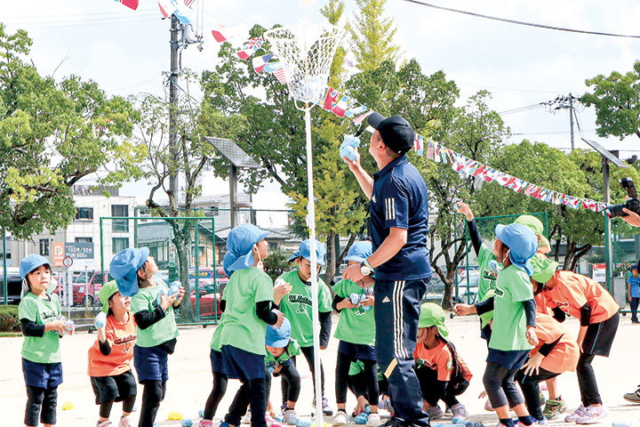 かごをめがけて玉を投げ入れる園児(撮影・山北)