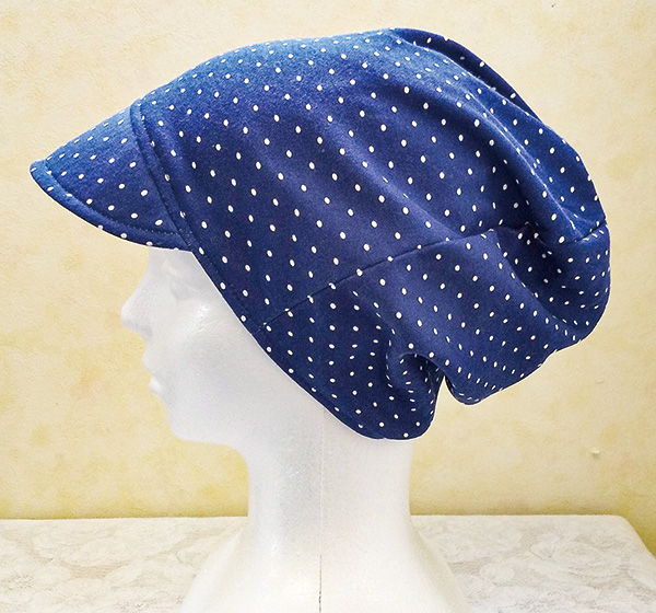 ケア帽子は、柄が入ったオシャレな帽子から、心が和む落ち着いた色の帽子までさまざま。小児がん患者のためのかわいいつば付き帽子もある。肌に触れる内側は、「地肌がかぶれないように」と、綿100%のニット素材を使用している。