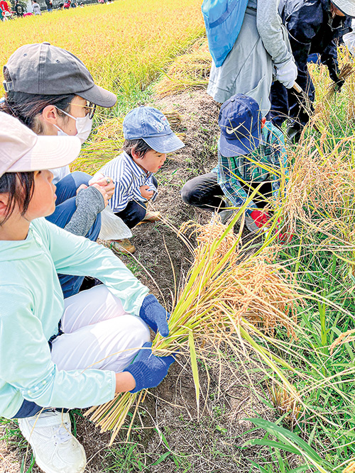 両親と参加した東広島市西条町の小島梨奈さん(9)は「稲刈りは初めての体験、参加できてよかった。とても楽しい」と話していた。稲刈りの後、精米工場の見学なども行われた。