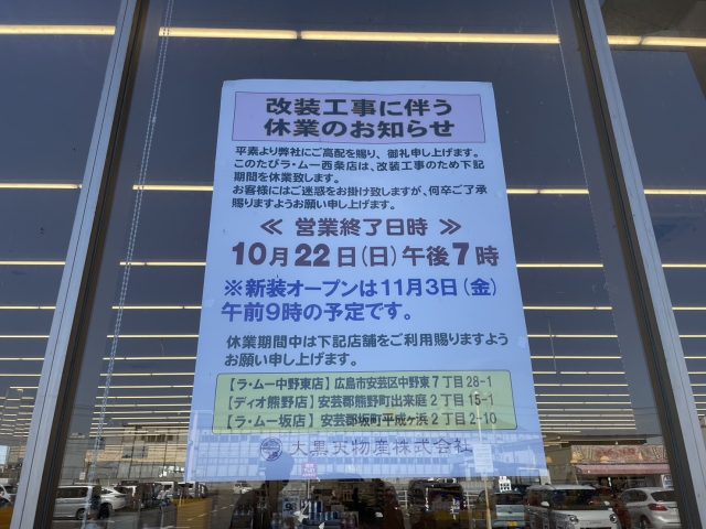 西条町寺家にある「ラ・ムー西条店」が店内改装のため、10月22日(日)19:00から休業(パクパクも休業)するようです。11月3日(金)朝9:00からリニューアルオープン予定とのことです。