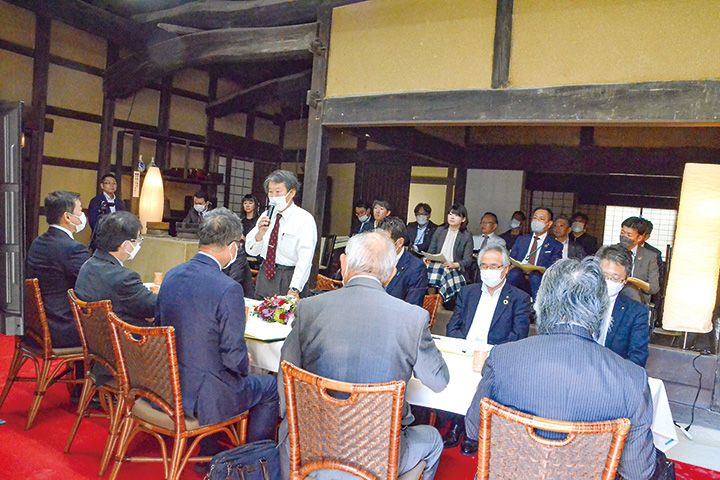 勉強会には、新谷正義衆院議員、旧石井家住宅の移築復元に尽力した広島大学の三浦正幸名誉教授、東広島市議会の奥谷求議長、市産業部の鈴木嘉一郎部長、市教委文化課の石井隆博氏など約30人が出席。観光庁観光資源課の遠藤翼氏、文化庁文化資源活用課の春田鳩麿氏もリモートで参加した。