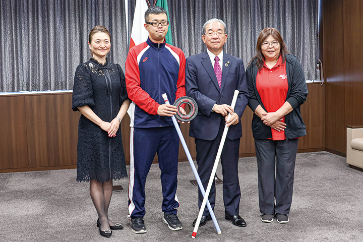 知的障害者が集うスポーツの全国大会「第8回スペシャルオリンピックス日本 冬季ナショナルゲーム」フロアホッケー競技に東広島市在住の岡野颯選手と洲崎雅裕選手が出場する。大会を前に10月31日、スペシャルオリンピックス日本・広島の崔希美理事長、浅野庸子理事・県事務局長、岡野選手が、高垣広徳市長を表敬訪問した。