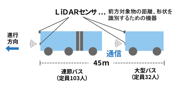運転手が行う操作をシステムが代わりに行い、自動で車を走らせる自動運転の技術と、2台のバスが通信を行い、カルガモの親子のように、一定の間隔を維持しながら、ひとかたまりで走る隊列走行の技術を用いたバス。バスの大きさは先頭の連節バスが18㍍、後続の大型バスが12㍍。車間距離を含めると45㍍で連なる。