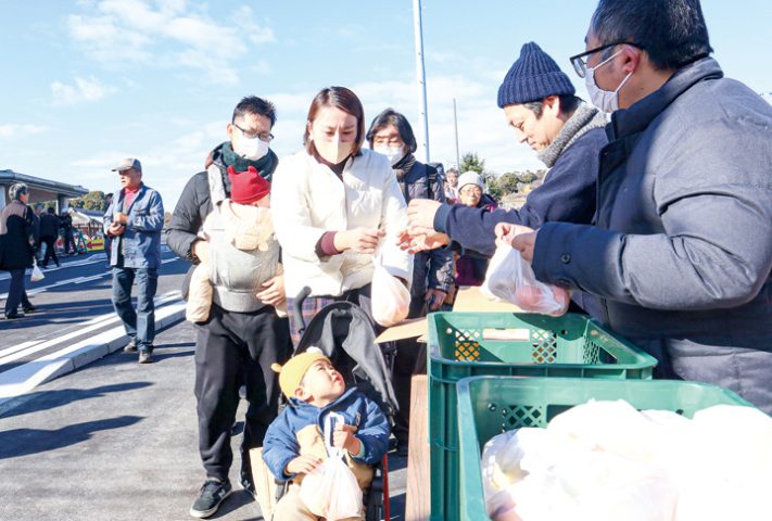 同橋のたもとで行われた開通式では、主催者を代表して同町商工会の橘高信行会長が「多くの人のご尽力で再び通行できるようになった」と感謝。この後、開通を待ち望んだ住民らが笑顔で一斉に渡り、先着200人に紅白もちと同町の特産品が配布された。