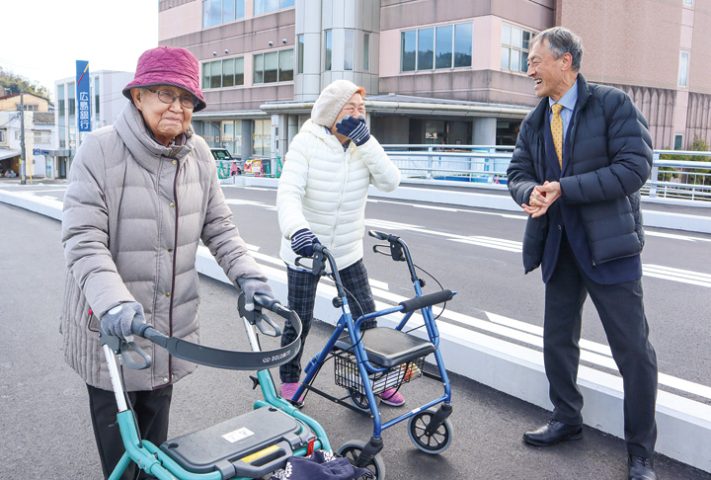 東広島市安芸津町三津の新興橋の架け替え工事が終わり、2年5カ月ぶりに通行が再開。開通式が昨年12月23日に行われ、住民ら約250人が開通を祝った。同橋は2021年7月の豪雨による濁流で被災し、通行止めが続いていた。