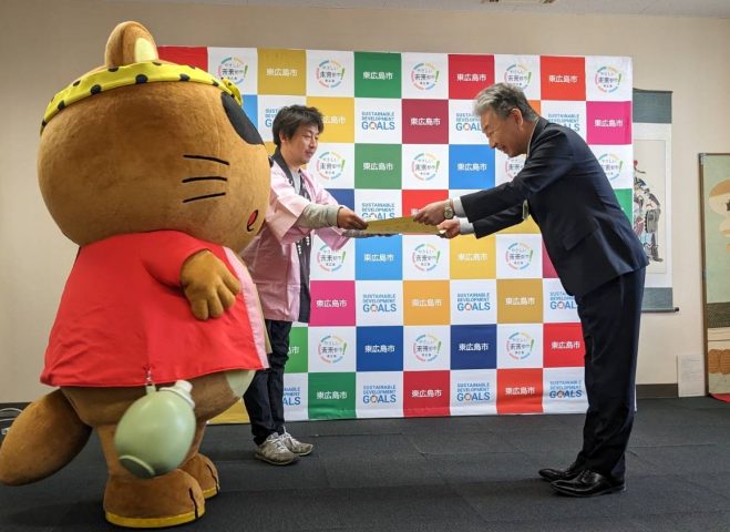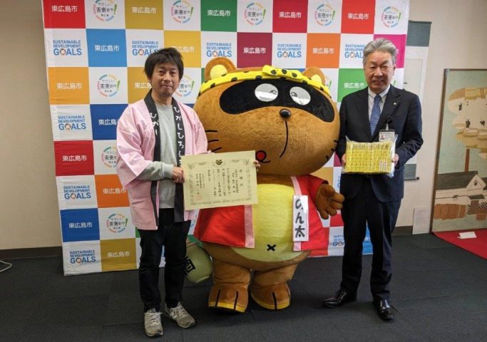 3月4日に東広島市役所であった寄贈式では、東広島市の観光マスコットである「のん太」が市場一也教育長に鉛筆を、市場教育長がのん太に感謝状をそれぞれ手渡した。