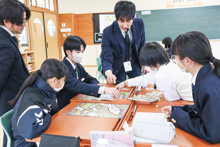 生徒らは4班に分かれて、山﨑さんが開発したボードゲームに参加し、オオサンショウウオの一生を学習。巣立ちからスタートし、途中で豪雨など五つの困難を乗り越え、次の世代に多くの卵を残すための自然環境について考えた。