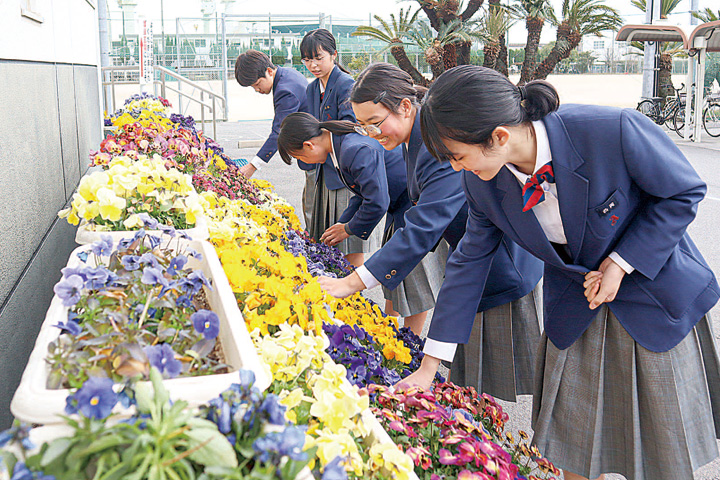 生徒らは、町内にあるカキ業者からカキ殻を提供してもらい砕いて肥料にし、約100個のプランターにパンジーなどの花を植えて世話をしたり、秋には、育てた菊を地域の9事業所へ配り地域の人に喜ばれたりしている。今年度は、美化委員会と総合文化部のメンバーが校内にある樹木の管理台帳を作成し、管理に取り組んだ。