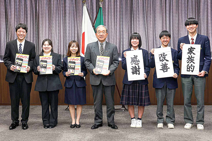 県立黒瀬高校(東広島市黒瀬町、藤田春恵校長)の生徒3人と広島国際大学(同市黒瀬学園台、清水壽一郎学長)の学生3人が3月8日、市役所を訪れ、介護の魅力を詰め込んだ動画とパンフレット「イマカイゴ」の完成を高垣広徳市長に報告した。