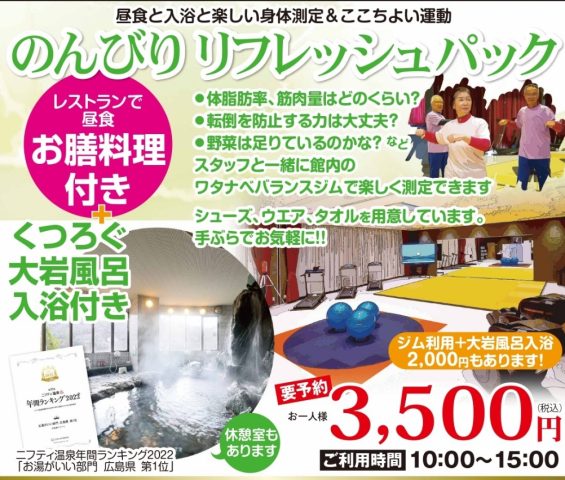トレーニングウエア、タオル、シューズ貸出、大岩風呂入浴付
