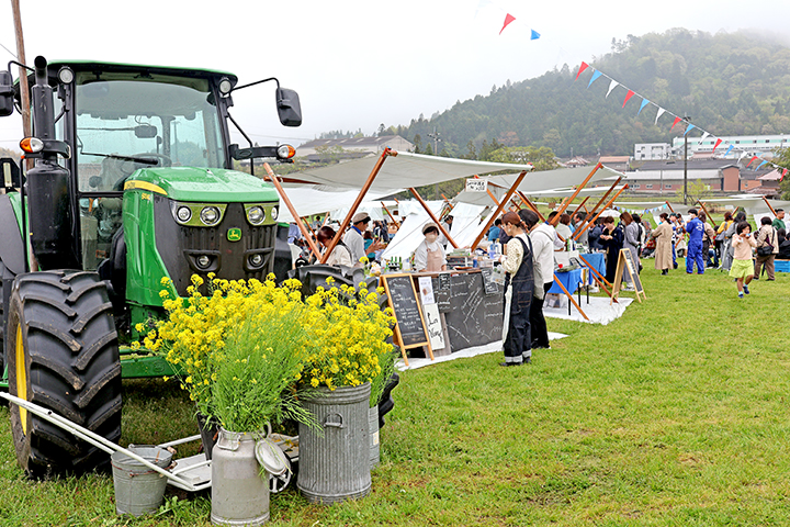 テーマは「つながるマルシェ」。地元食材を使ったキッチンカー、手作り雑貨、木工体験など県内48事業者が出店。豊栄中学校の発表やミルク早飲み競争もあった。