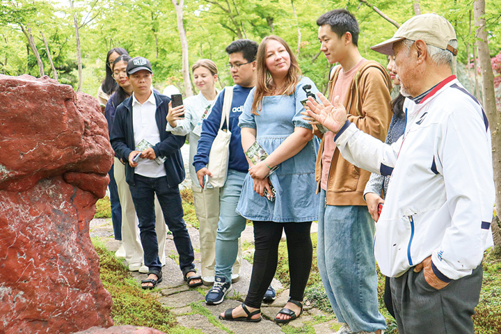 見学に訪れた留学生ら15人は、2グループに分かれ、全国の銘石・奇石・組石についての解説を聞きながら鑑賞し、新緑の庭園内を散策。水が15㍍の高さから流れ落ちる仙神大滝に見入ったり、仙石富士の頂上から庭園を眺めたりしたほか、ガイドから「庭園最大の石の重さは24㌧」と聞き、顔を見合わせ驚いていた。