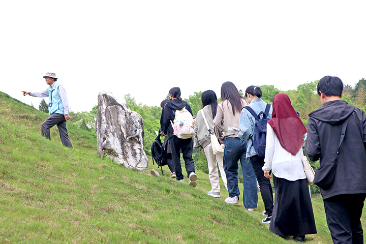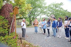 台湾出身の彭友亮さん(23)は「台湾には石が主体の庭園がないので、緑や赤のカラフルな大きな石を見て楽しかった」と庭園の美しさに感動。山名館長は「東広島に日本文化を代表する庭園があることを留学生に知ってもらい、世界に広めてもらえたら」と話していた。