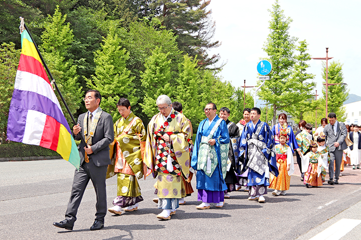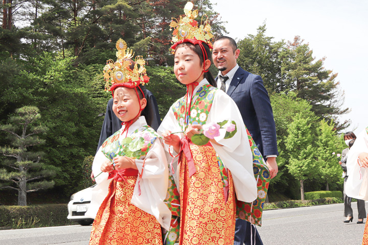 稚児行列には西条下見地域や県外からの男女の子ども50人と保護者ら計約150人が参加。門徒総代長の黒田正則さんを先頭に、赤や紫の袴や緑地の「金襴」を着た子どもたちは春空の下、晴れ晴れしい笑顔で歩いた。第14世住職の水戸法道さんは「今回の行事を通して幸せになってほしい」と話していた。