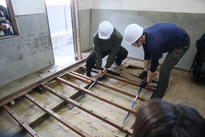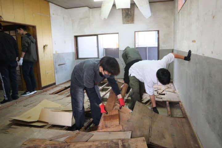 5月11日には、キックオフイベントを空き家で開き、関係者約100人が参加した。同市の川口一成副市長が「Town&Gown構想のモデルケースとなるように一体となって推進する」、地域代表の菅井晃彦さんは「まちづくり合同会社G11(ジー・イレブン)の設立に向けて準備を進め、地域の魅力や活力を高めていきたい」とそれぞれあいさつ。この後、同大工学部建築学科の学生らがバールなどの工具を使い、1階(2部屋)の床と天井を解体。2階(4部屋)は、ドアやキッチンの取り外しなどリノベーションに着工した。