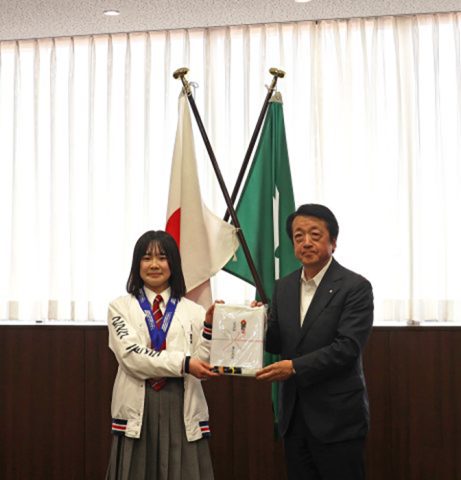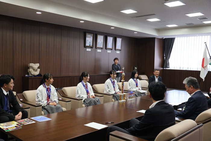 【写真】川口一成副市長を表敬訪問した近畿大学附属広島中学校東広島校ダンス部