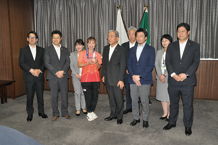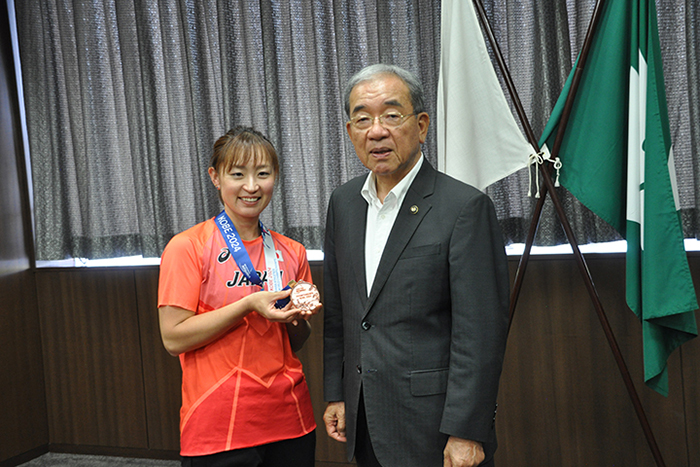今年5月の世界選手権で銅メダルを獲得し、メダルを手にする中西さん(右:高垣市長)