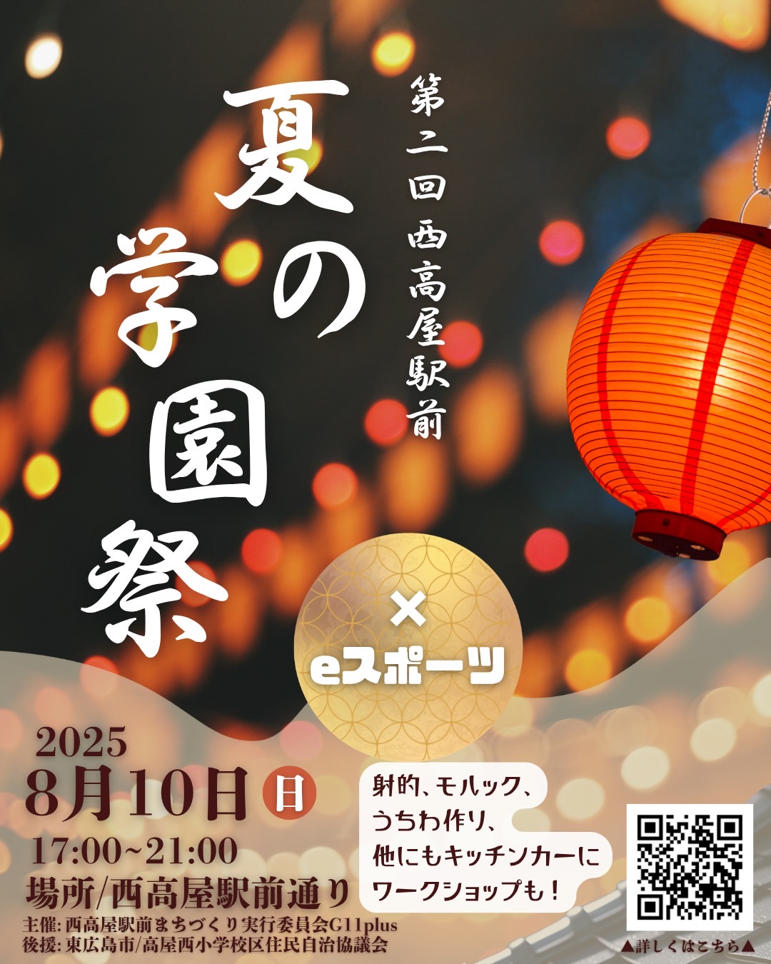 西高屋駅前イベント実行委員会(合同G11)は8月10日、東広島市高屋町中島の西高屋駅前通りで「西高屋駅前夏の学園祭×eスポーツ」を開催します。