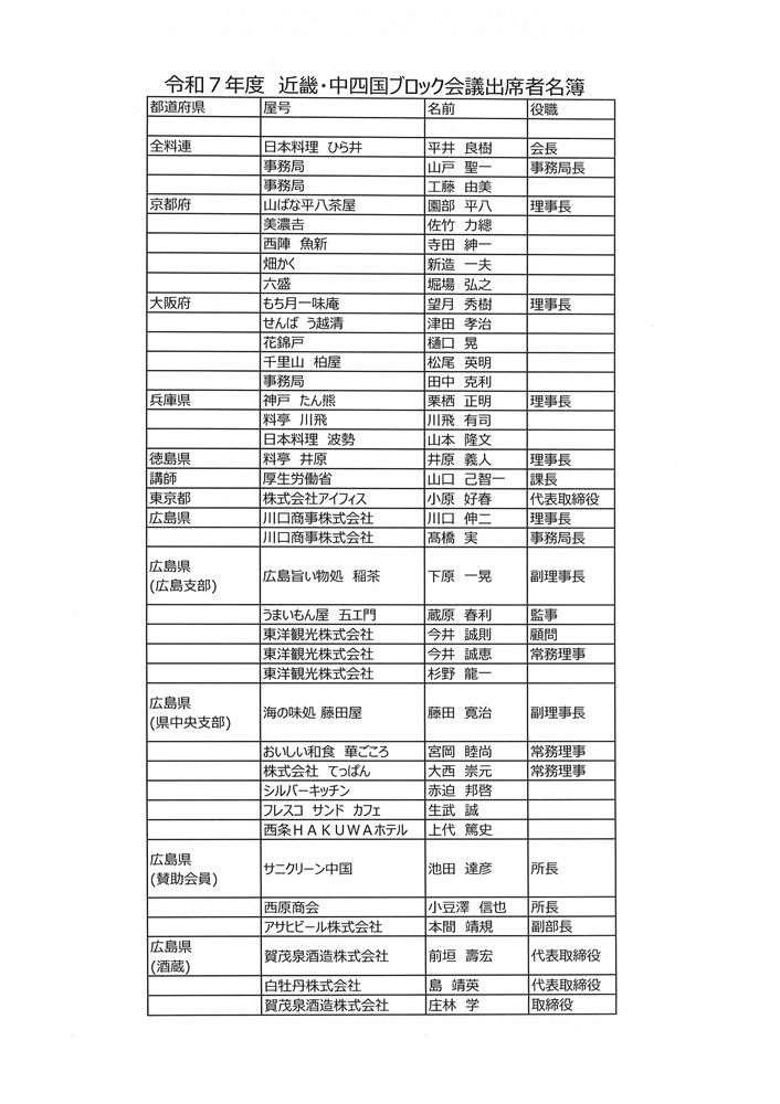 全国料理業生活衛生同業組合連合会の近畿・中四国ブロック会議がこのほど、東広島市西条岡町のホテルヴァンコーネルで開かれた。各地から料理業界の関係者約40人が集まり、最新の衛生対策や経営課題について意見を交わした後、懇親会では地元食材を使った料理が振る舞われた。地元の酒造会社の賀茂鶴酒造、賀茂泉酒造、白牡丹も参加した。