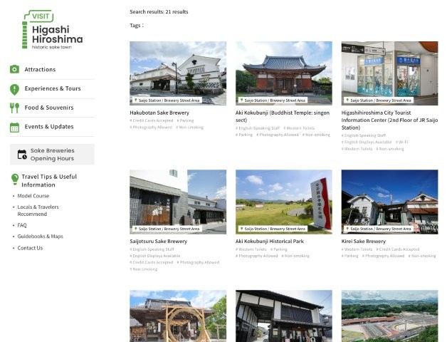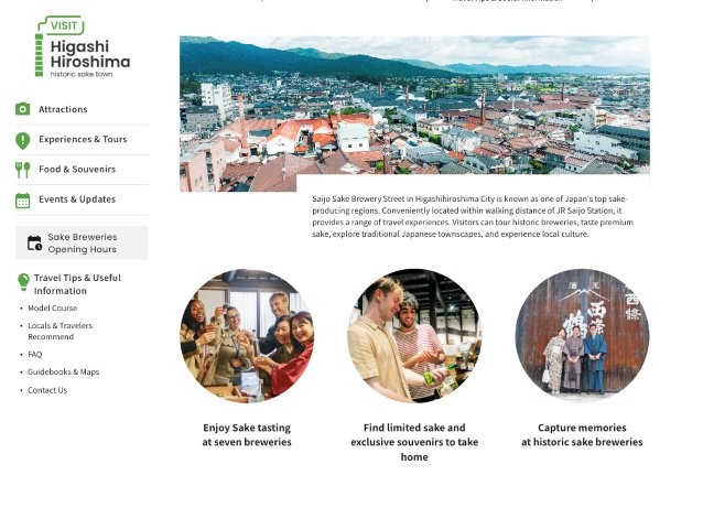 東広島市の観光情報を英語で発信するウェブサイト「VISIT Higashihiroshima」がオープン。「西条酒蔵通り」など市内21の観光スポットをはじめ、イベント、体験見学コンテンツ、飲食店情報などが紹介されています。