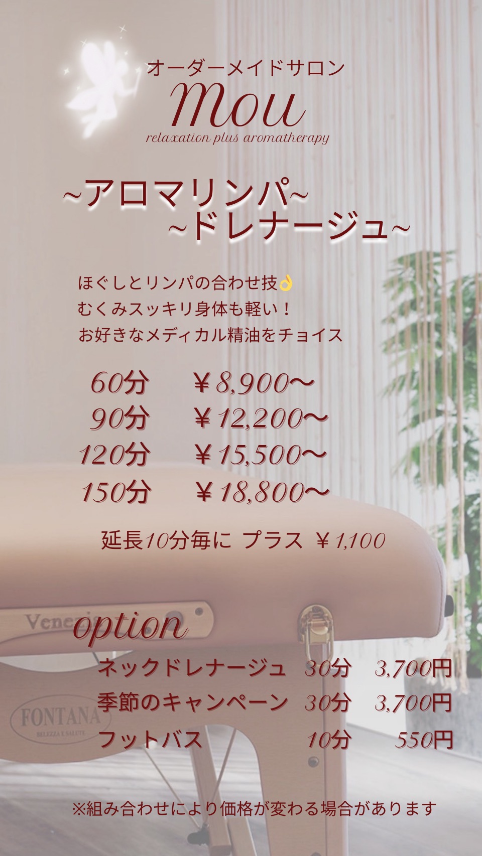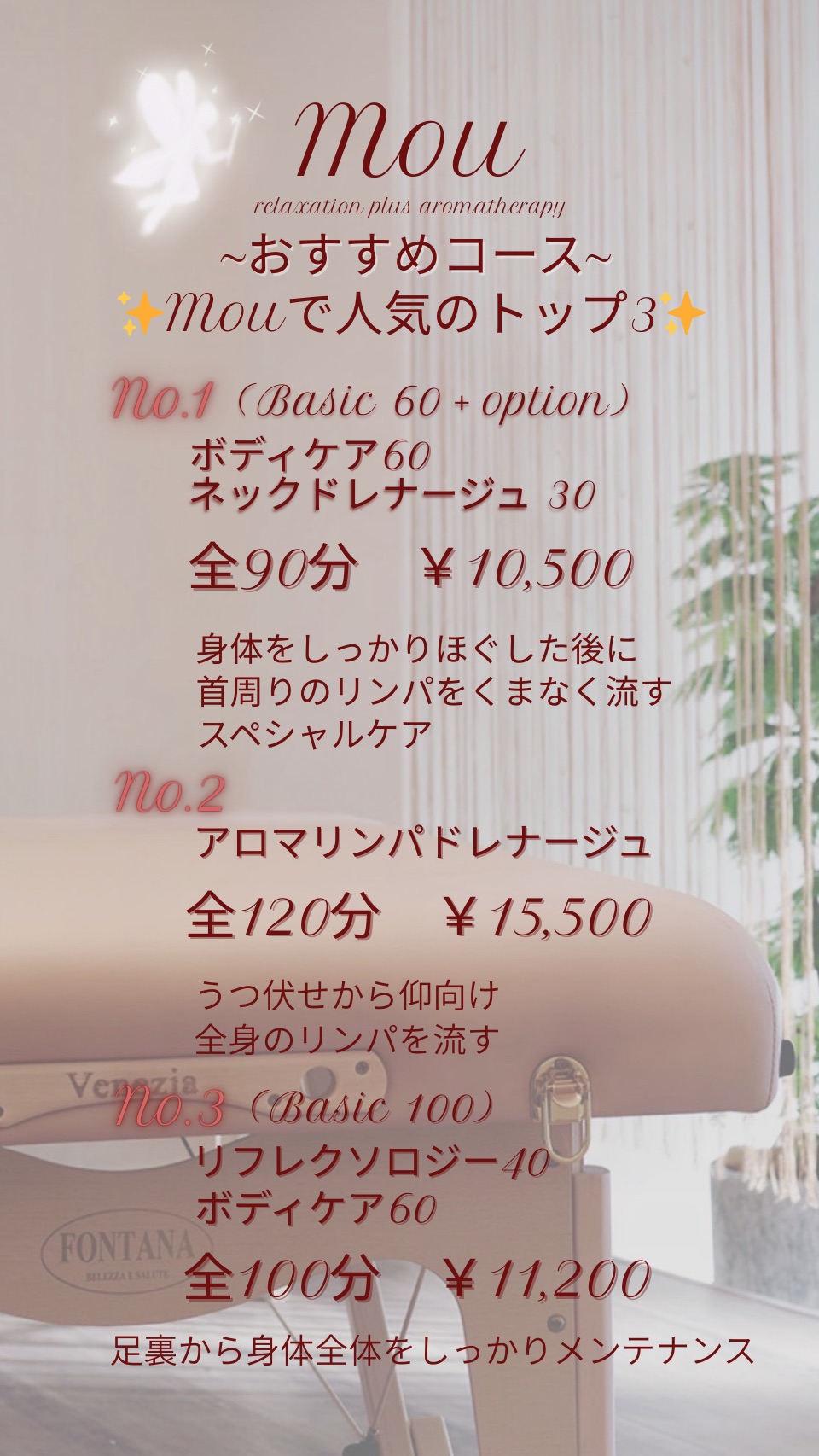 東広島市西条町御薗宇のもみほぐしやリフレクソロジー、リンパドレナージュの施術をするリラクゼーション・アロマ「Mou(ムー)」は、年末12月30日まで営業します。長期休暇の年末年始に利用しやすいよう、年始も1月3日から営業。