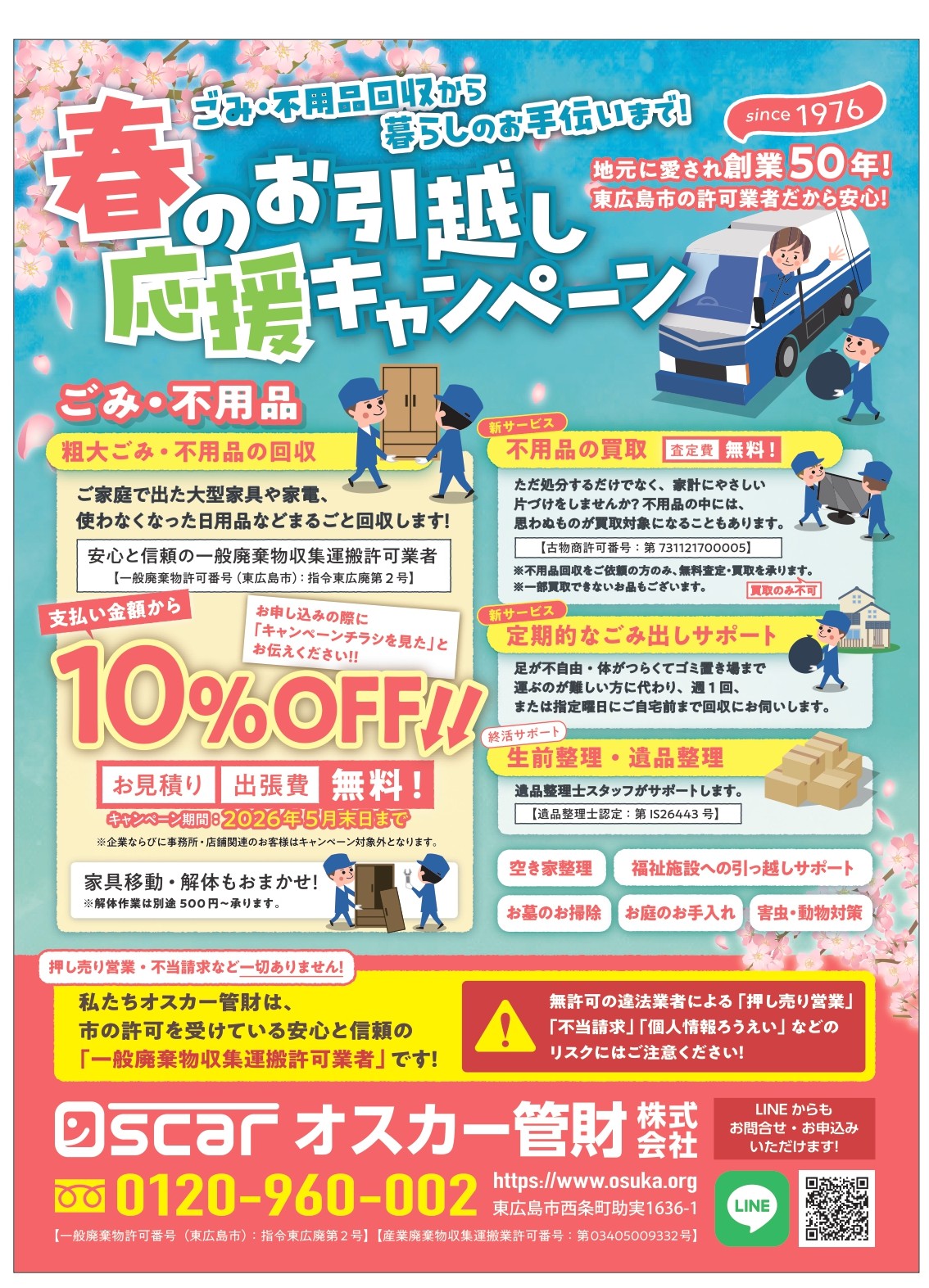 創業50年、一般廃棄物収集運搬許可業者のオスカー管財は2026年5月末まで、春のお引越し応援キャンペーンを実施しています。大型家具や家電、日用品など回収します。