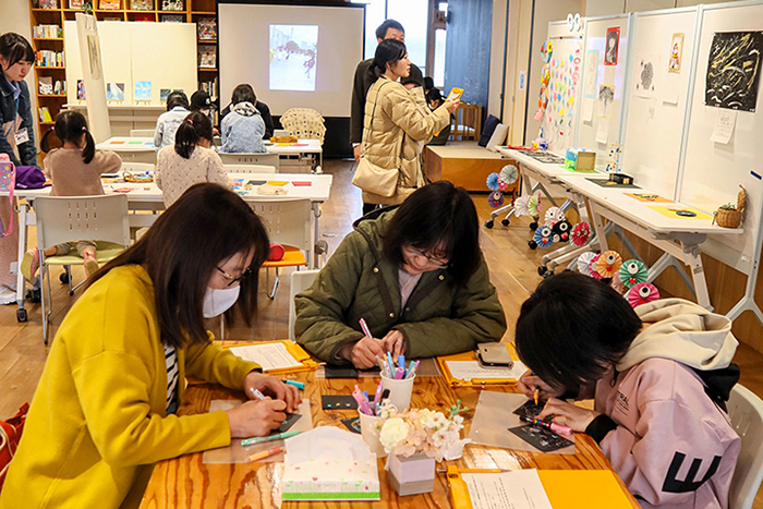 今回は、メンバーらの作品と市内のスペシャルサポートルーム(SSR)に通う小・中学生の作品展示、メンバーの得意なことを生かしたマスキングテープコラージュと点描画のワークショップを企画した。