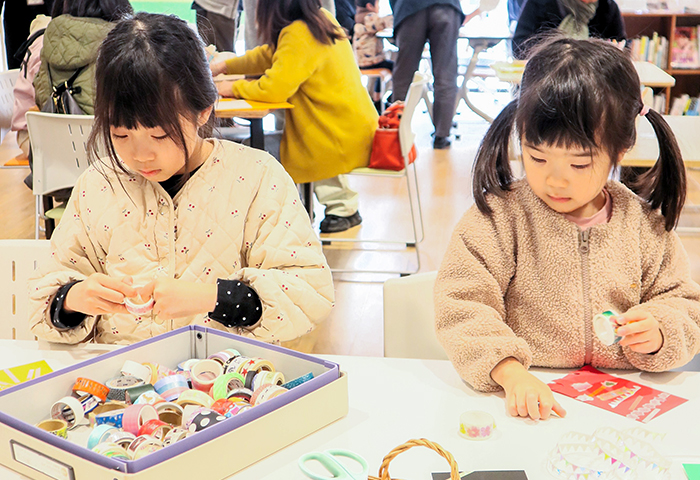 高校生の志穂さんは、アートが好きで「みんなに楽しんでもらえるワークはないかとインターネットで探してマスキングテープコラージュを見つけた」という。ワークショップを担当し、訪れた人にやり方を丁寧に教えた。